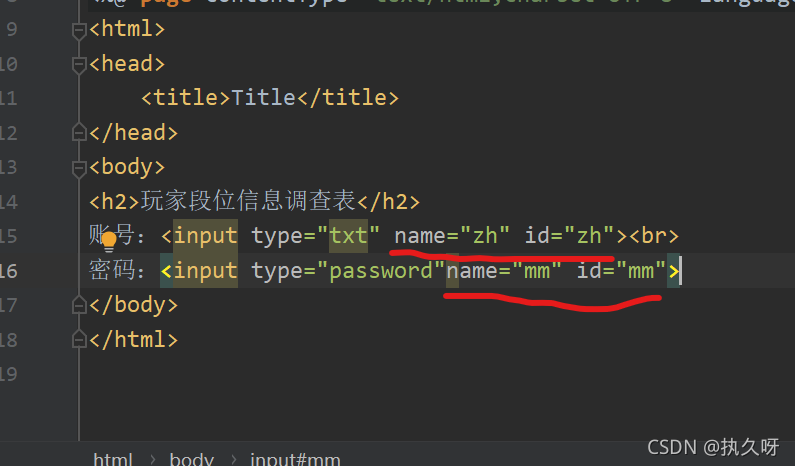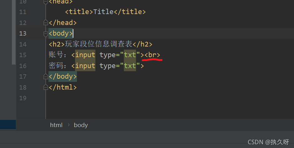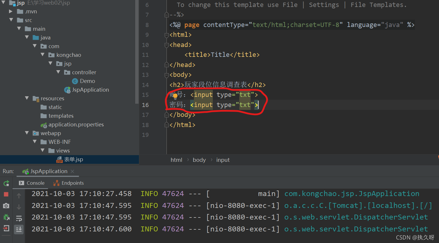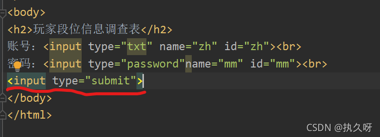 第二步:我们输入以下圈起来的内容,<input type=" ">是格式,"txt"表示后面是一个框