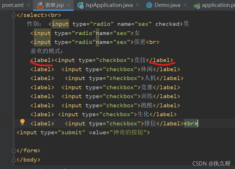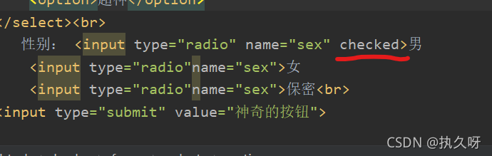 我们要想给这个加上一个默认值,默认选的那个,只需要加上checked即可如