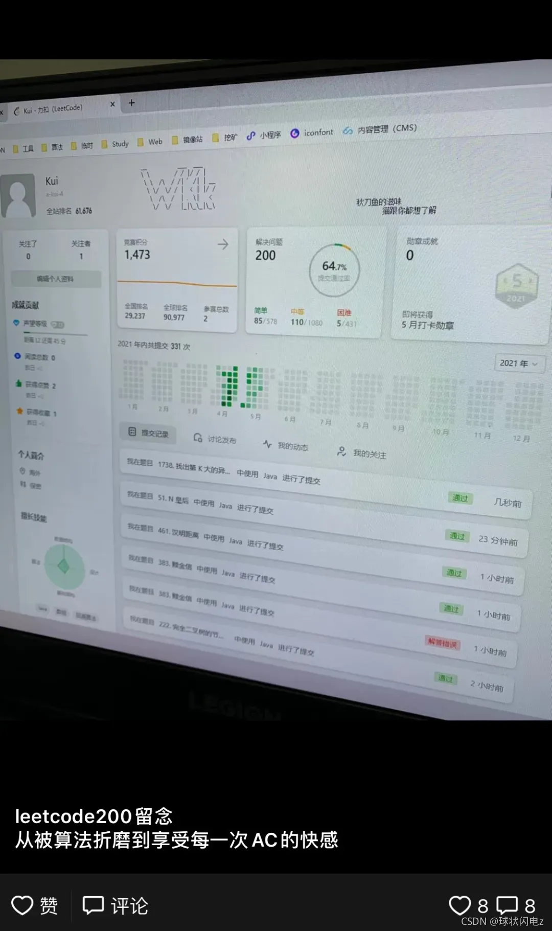 大厂面试前一般要进行算法笔试,看到牛客大佬的简历上常有leetcode的字眼。不多说,开始刷题,刚开始是痛苦的,唯一的动力是Accept后短暂的兴奋。