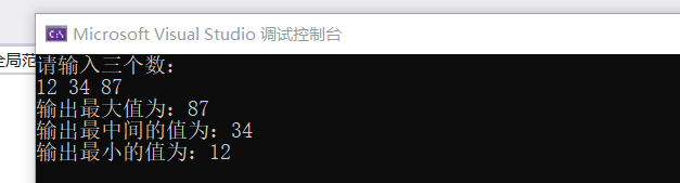 先用主函数比较出三个中最大的一个,并且构建一个比较两个数大小的函数我选用的是void,不需要返回值直接打印出后两个的结果。主函数找到最大值之后,利用if语句排除最大值,然后把剩下的两个数放入构建函数中,利用比较两个数大小的方法来求出中间值还有最小值。