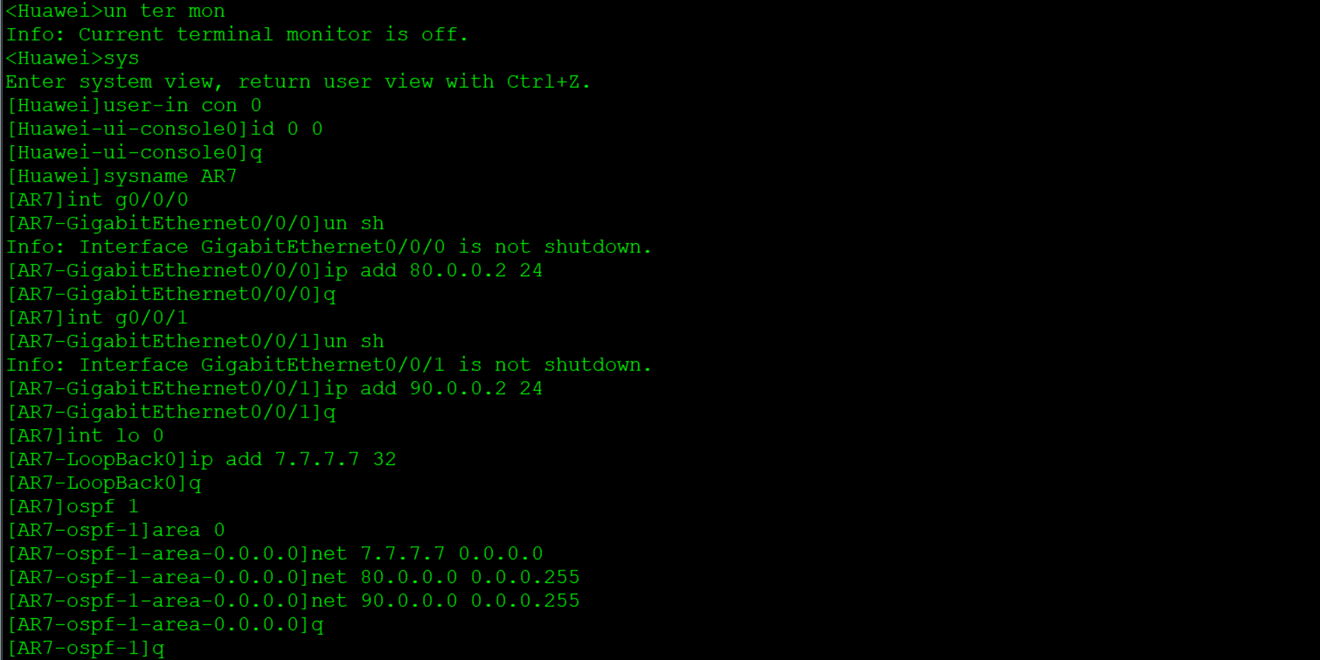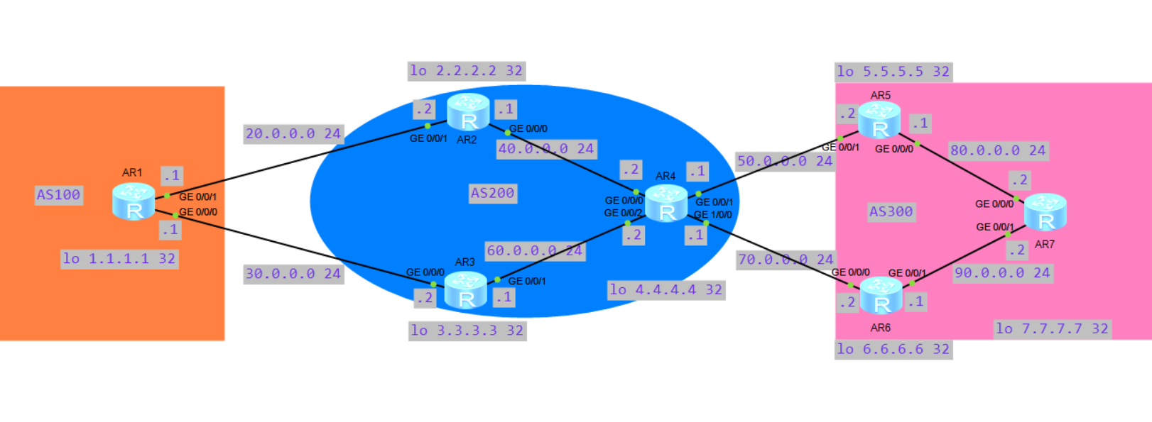通过配置BGP和修改BGP属性,实现R1到R7的路径为R1->R2->R4->R5->R7,R7到R1的路径为R7->R6->R4->R3->R1