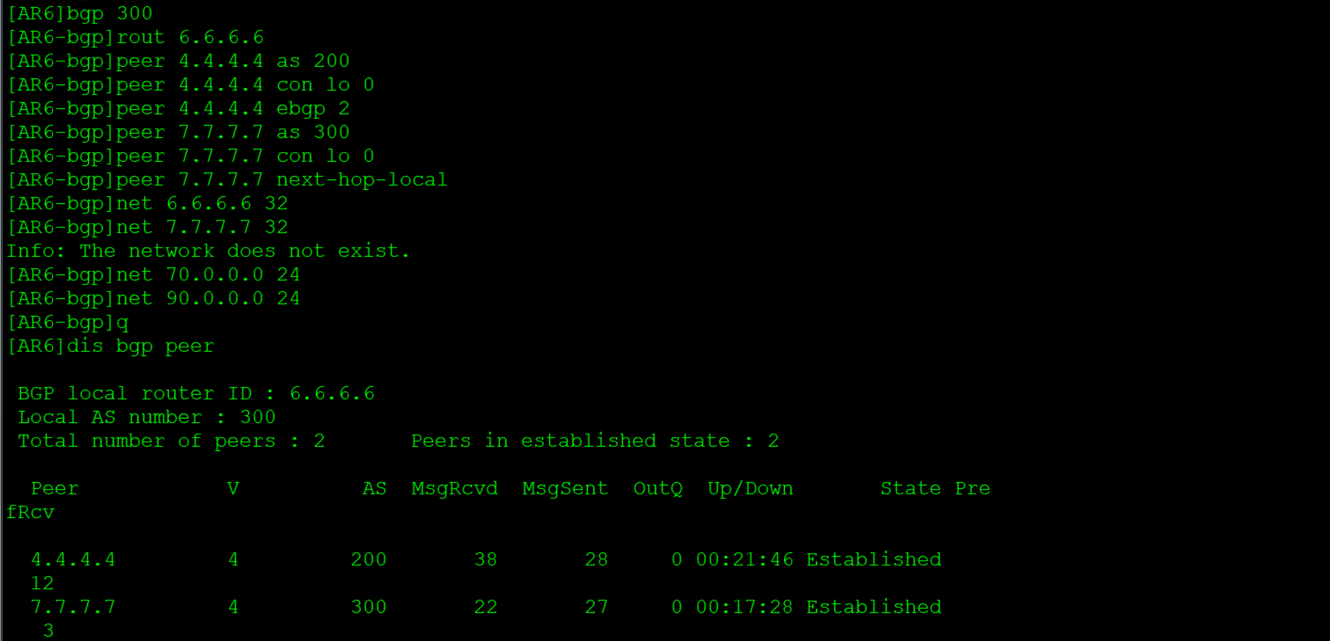 - 如果收到正确的Update或Keepalive报文,那么BGP就认为对端处于正常运行状态,将保持BGP连接
