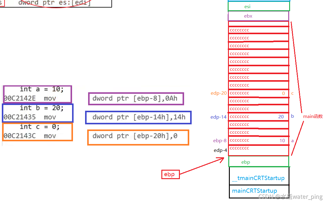 接下来我们逐步看通过反汇编代码,内存中会发生什么变化: