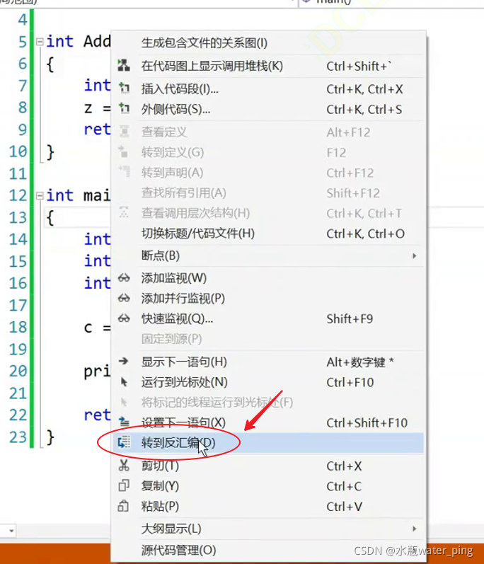 我们回到程序,回到编译器按下F10,代码右键鼠标点击转到反汇编: