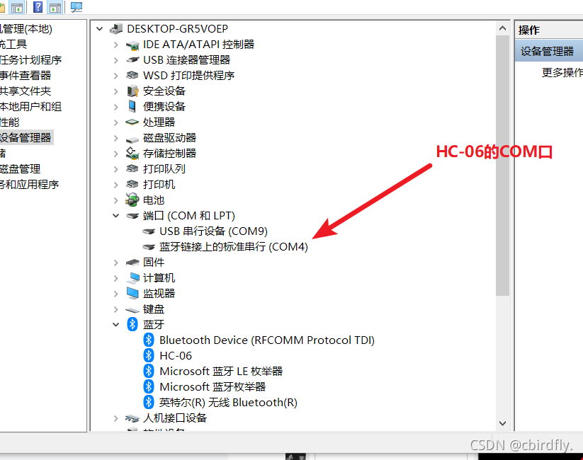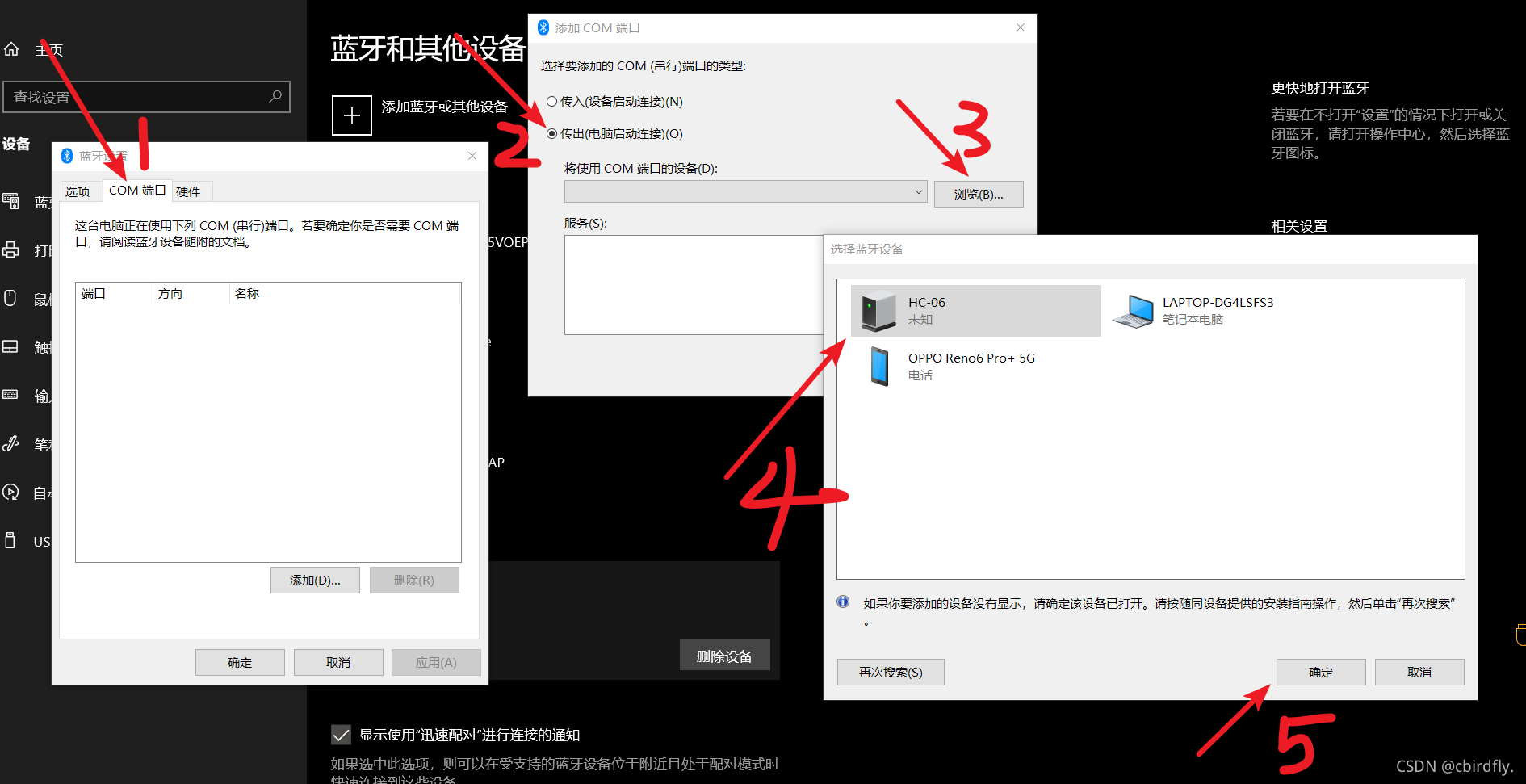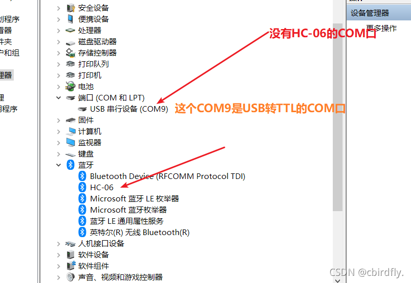 而我一开始用电脑配对蓝牙时候,电脑管理器里面有HC06,但是没有COM口显示。后来折腾了半天,才发现,需要自己给HC06分配COM口,正确的流程步骤如下: