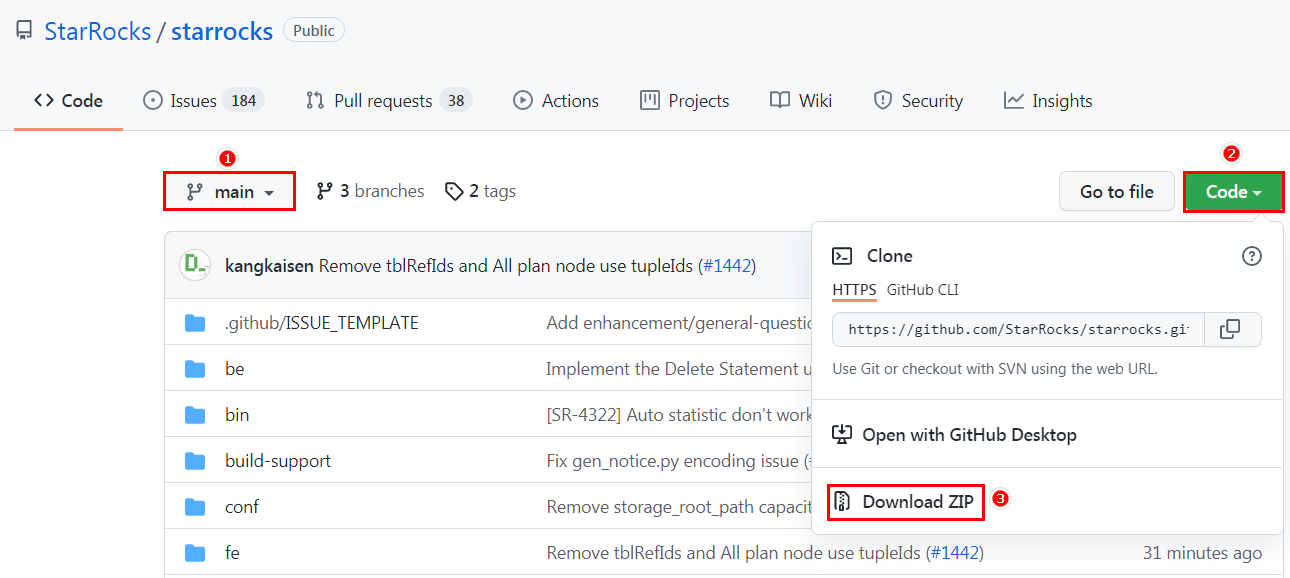 fatal: unable to access 'https://github.com/StarRocks/starrocks.git/': Encountered end of file因国内网络原因,这种方式有时可能拉取不下来。我们可以从github上直接下载代码包,下载地址为: