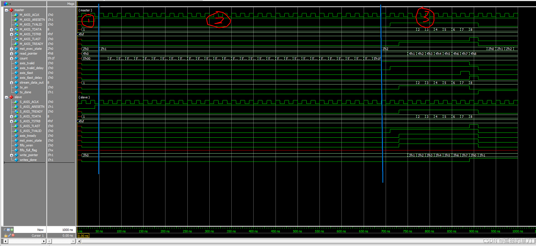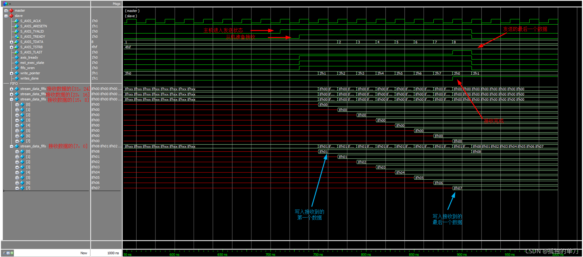 可以很清楚的看到这里的AXI4-Stream协议的握手过程,主机先拉高TVALID,等待从机拉高TREADY后进入发送状态(可以看到这里一共发送了9个数据(1-1-2-3-4-5-6-7-8) ,后面从机定义的FIFO又只接收了8个数据。所以我个人猜测这里应该是有点问题的,可能是想要发送1-8或者0-7这8个数据?)。
