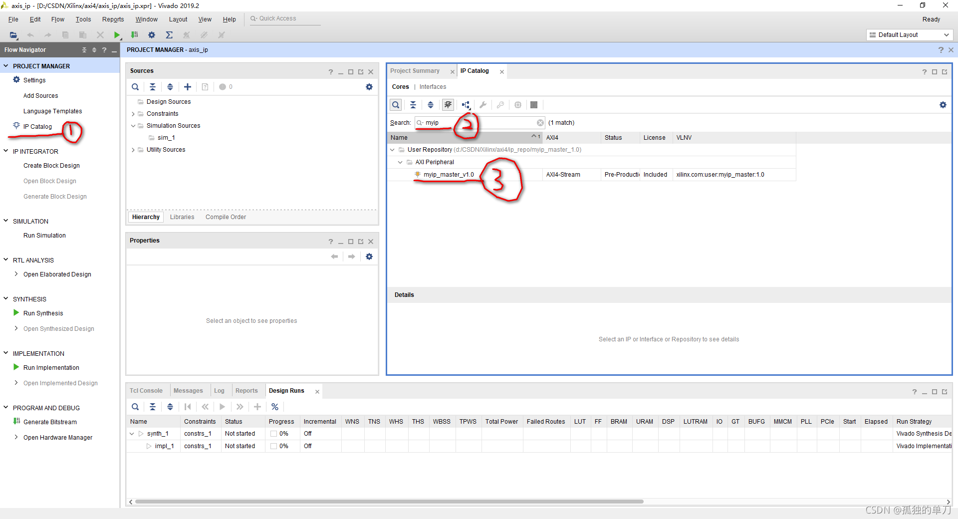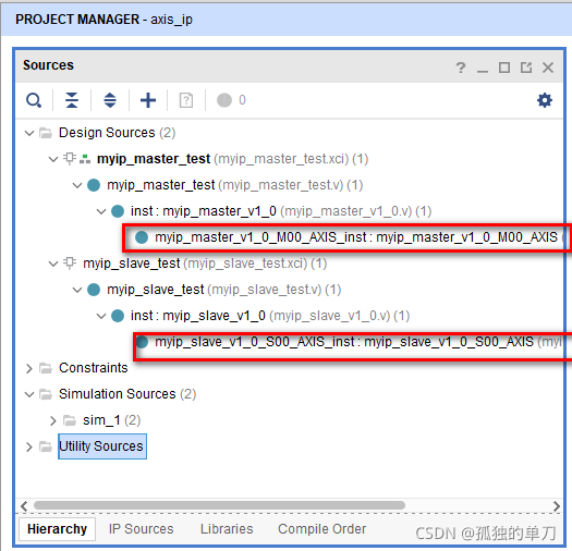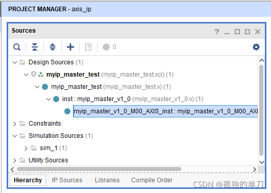 此时在source框中已经生成了IP,下图中文件myip_master_v1_0_M00_AXIS即为底层逻辑文件(后文简单称为发送文件或主机文件)