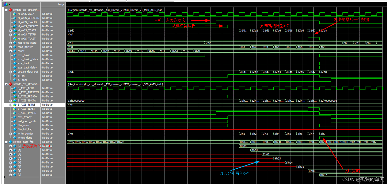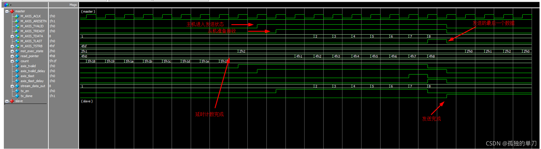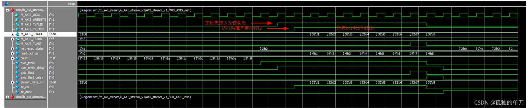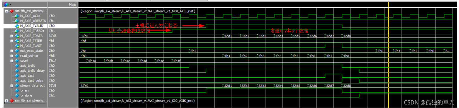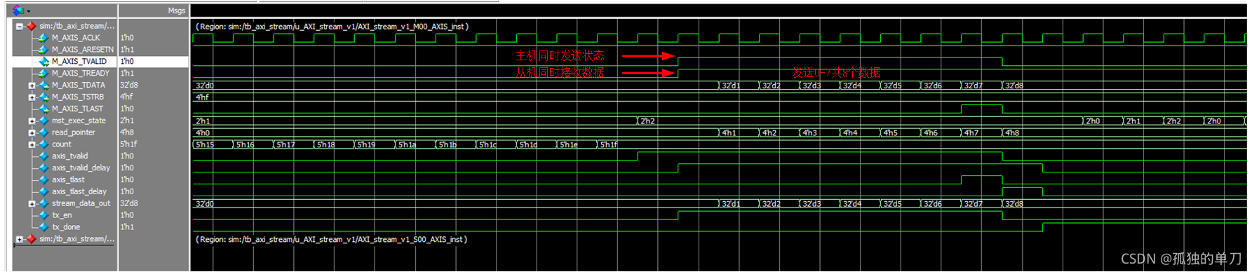 主机先拉高TVALID,从机后拉高TREADY:发送了0-7共8个数据