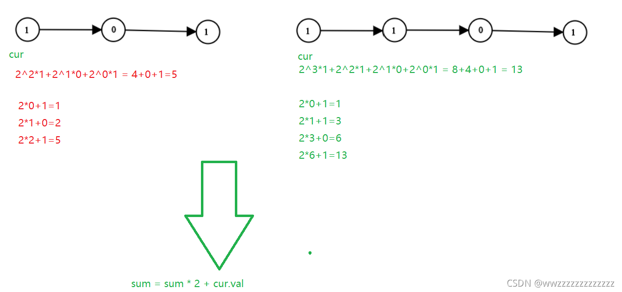 1.转化为2进制,相当于十进制的链表转换成十进制数同理,用(sum * 10 + head.val)就可以恢复成十进制数