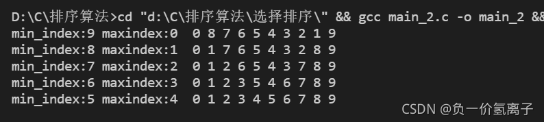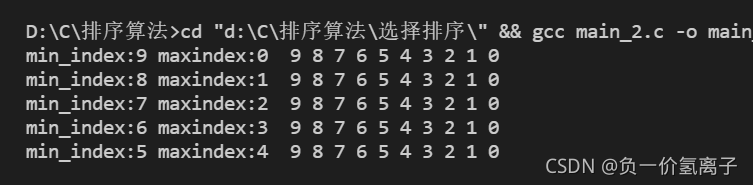 可以看到 ,第一次遍历,最小值下标是9,最大值下标是0,处理过程是将num[min_index]放在序列开头,num[max_index]放在序列末尾,即num[0] <——>num[9],即num[0]和num[9]只需要一次换值;