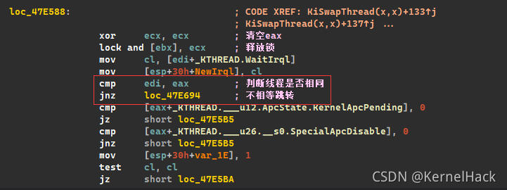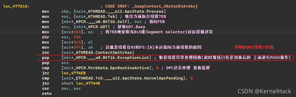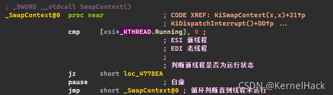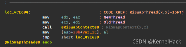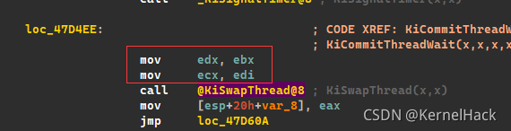 线程查询校验全部完毕后最终跳转此处(EDX为要切换线程,ECX为当前线程),执行函数KiSwapContext.