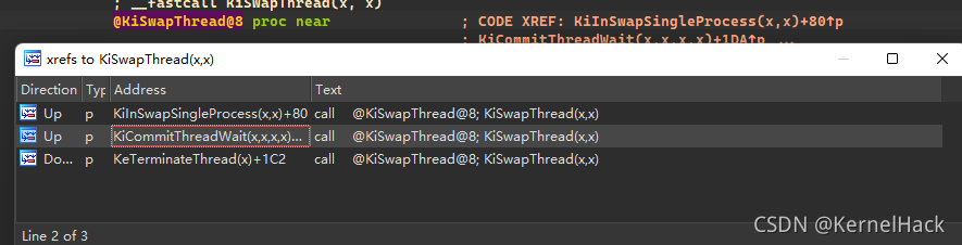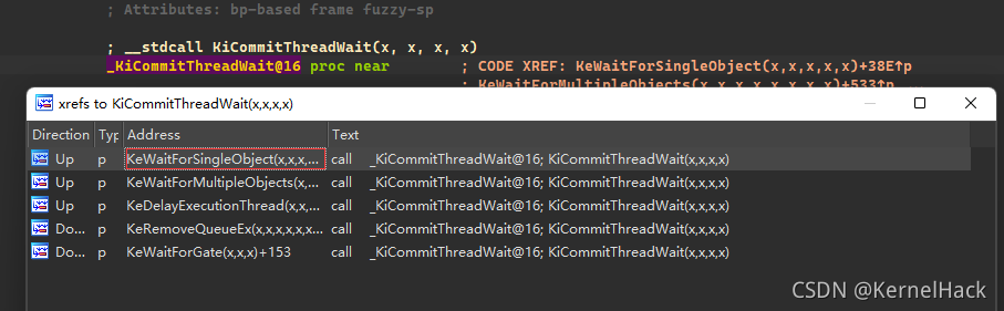 通过交叉引用查看哪些函数调用了KiCommitThreadWait
