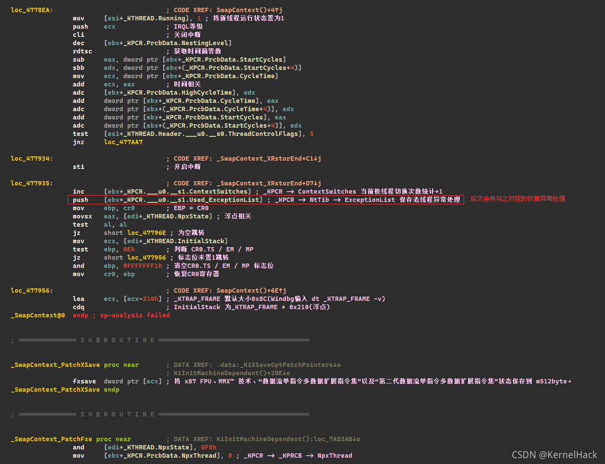 线程切换KiSwapThread函数在不同版本系统下实现都有略微差异.只研究核心代码.