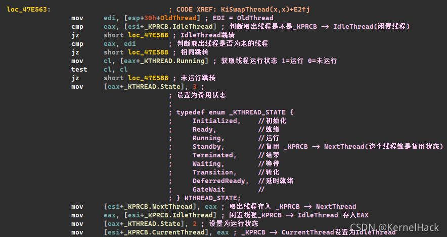 分析得知函数首先直接获取_KPRCB结构中NextThread,如果此值不为空,将NextThread设置为0,并且把取出线程设置为KPRCB.CurrentThread,线程KTHREAD.State设置为2后直接返回该线程结构.